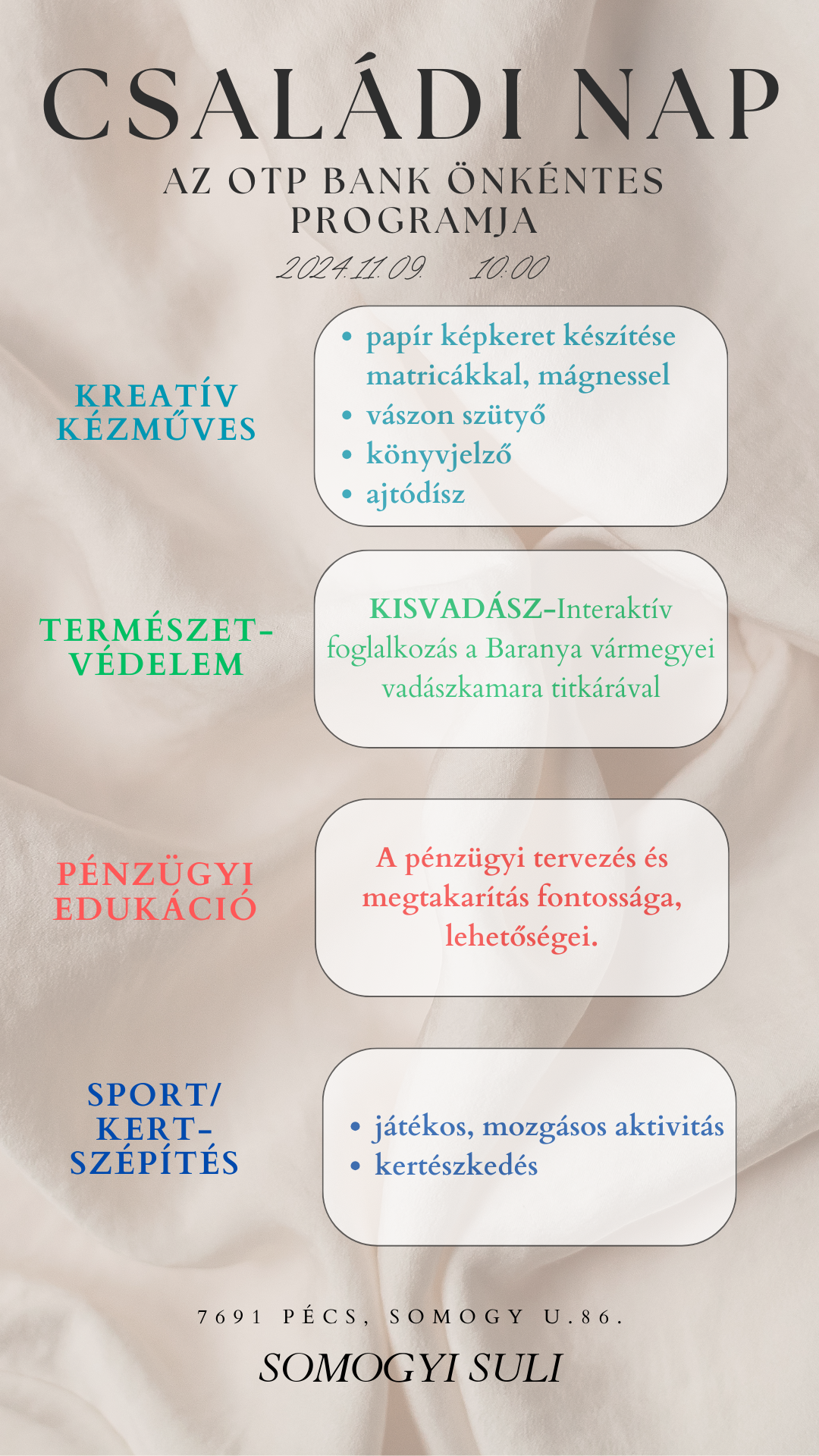 Szeretettel várunk minden érdeklődő családot az OTP Helyi Érték Program nyertes pályázata mentén szerveződő családi napunkra.